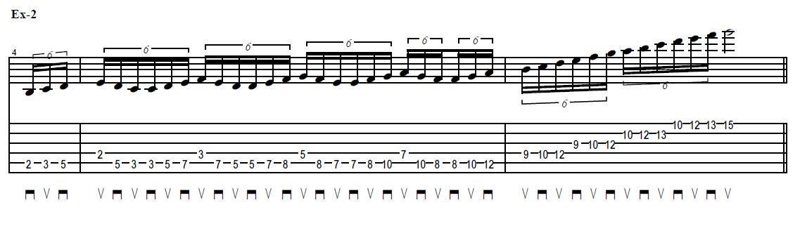 このフレーズの肝は弦移動の際に(高音弦側へ移動の際)必ずアップピッキングで入っているということです